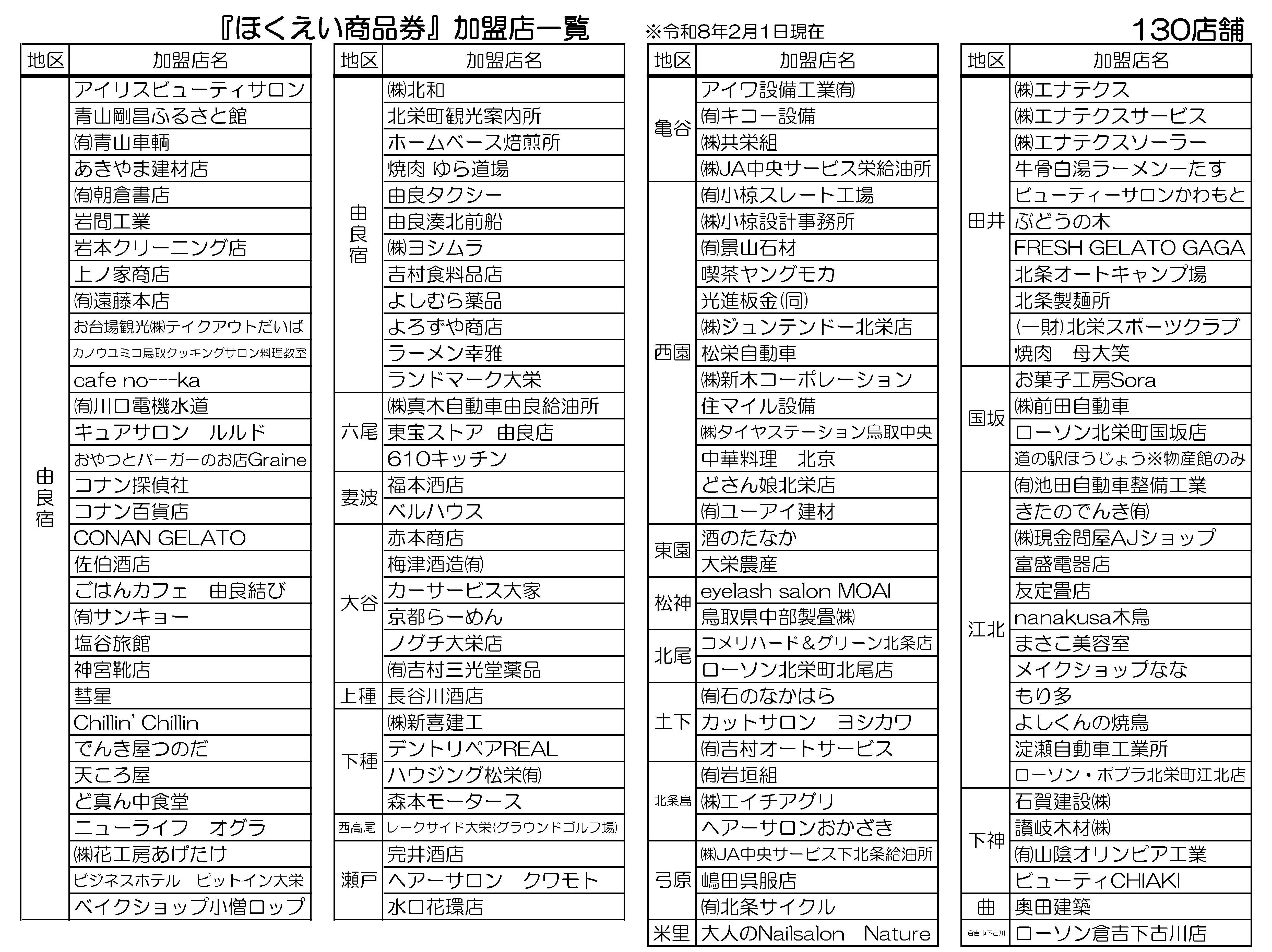 〇「ほくえい商品券」取扱加盟店は以下のとおりです。(随時更新します)