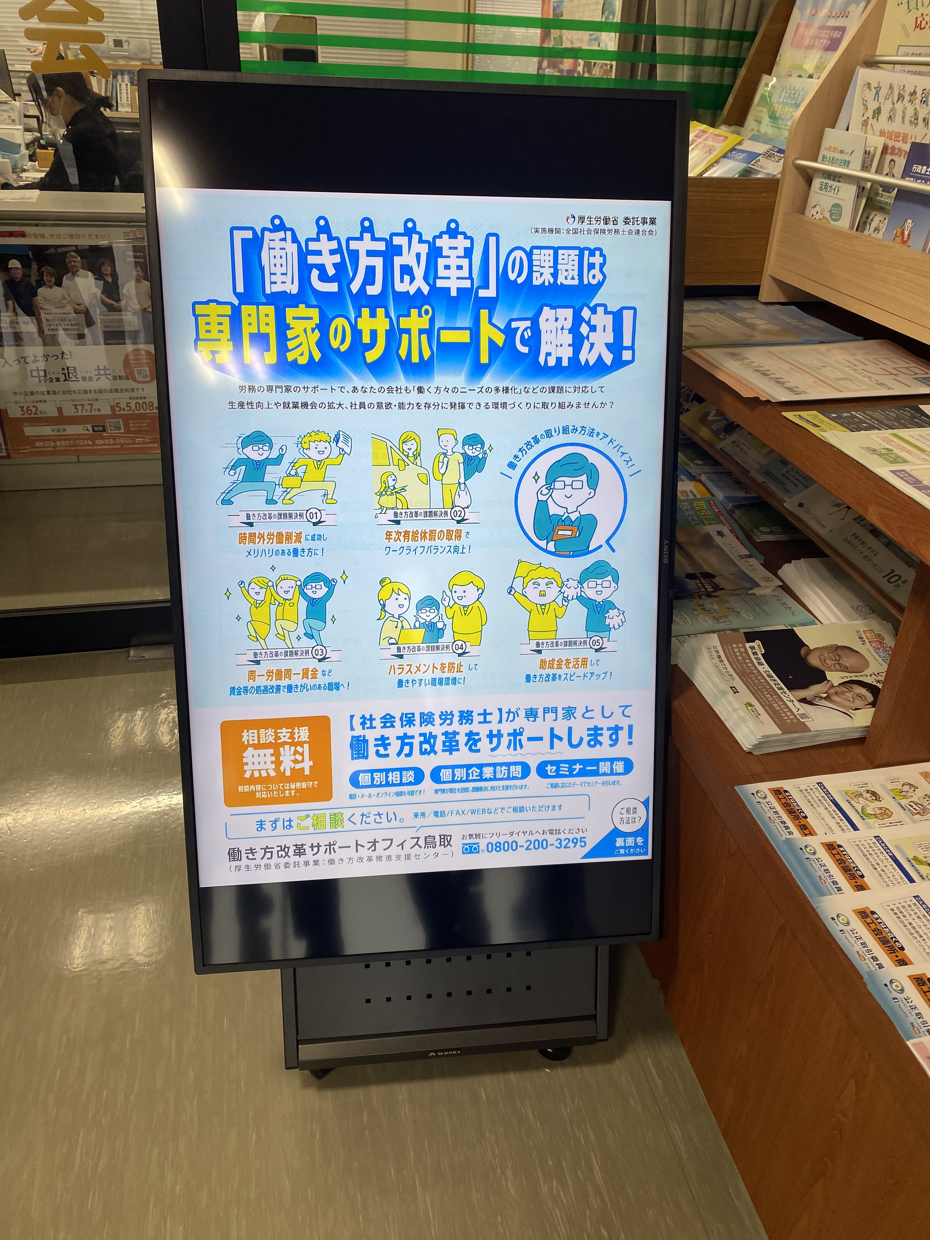 北栄町商工会では、働き方改革推進支援助成金(団体推進コース)を活用し、働き方改革の取組・施策情報等を会員の皆様に普及啓発するため、令和8年1月19日に会館入口にデジタルサイネージを設置いたしました。労働関係の制度改正や助成金情報の提供のほか、働き方改革関連の助成金の活用好事例や専門家による無料相談など随時掲示させていただきます。ご来会の際には、是非ご覧下さい。